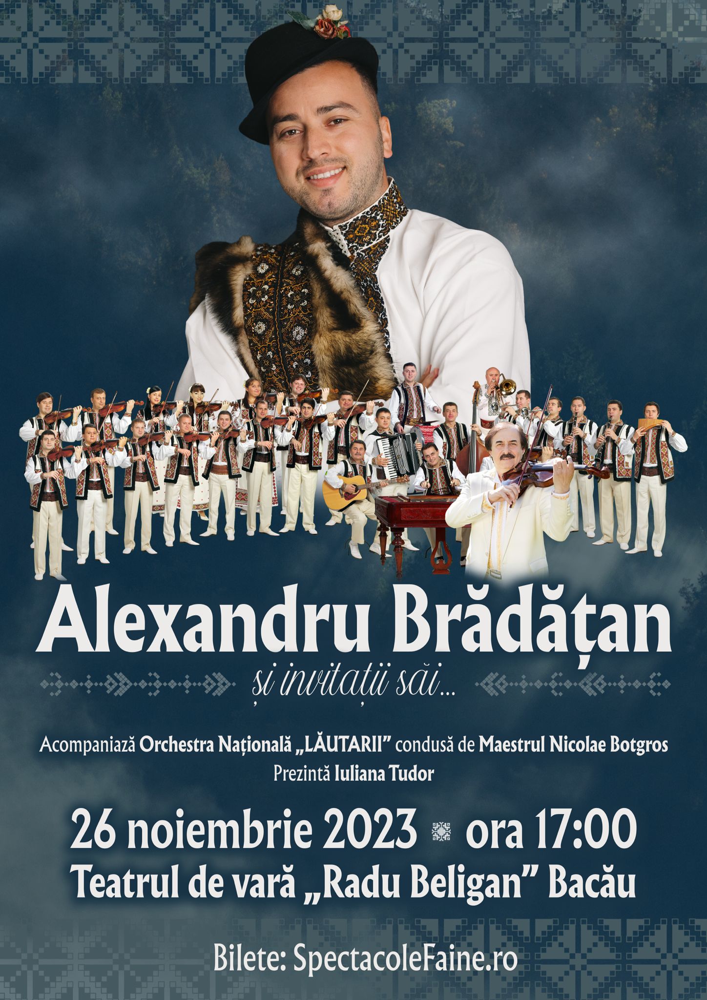 “ Alexandru Brădățan și invitații săi … “ îi așteaptă pe toți cei ce vor să se bucure de muzica populară adevărată duminică, 26 noiembrie, ora 17.oo la Teatrul de vară Radu Beligan din Bacău sub aleasa prezentare a IULIANEI TUDOR.