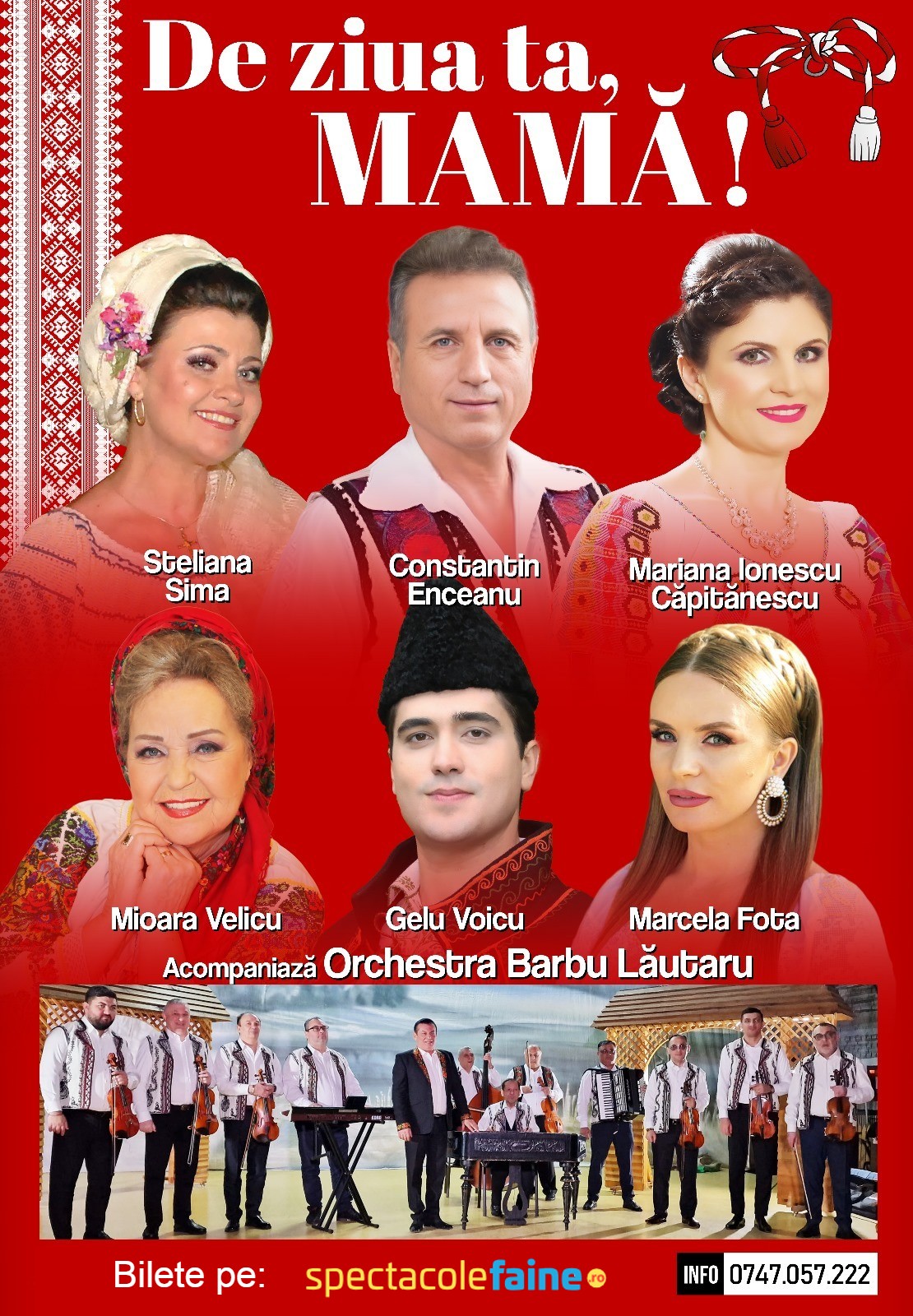Mari artiști ai scenei românești, interpreţi de muzica populara, se reunesc in luna martie intr-un amplu turneu national cu ocazia unui spectacol dedicat zilei femeii, un eveniment numit De ziua ta, Mama! care se anunta deja a fi concertul extraordinar al primaverii.